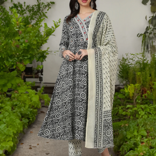 Floral Printed Anarkali Kurta with Trousers & Dupatta For Women Size