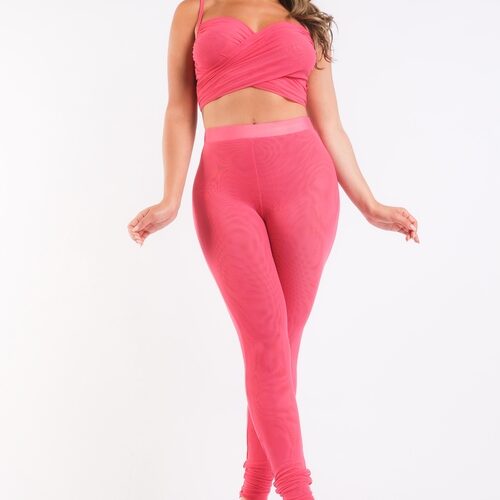 Mesh Contrast Sets Casual Sports Strappy Sleeve Top & Leggings FUCHSIA