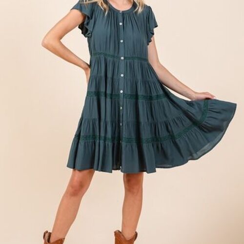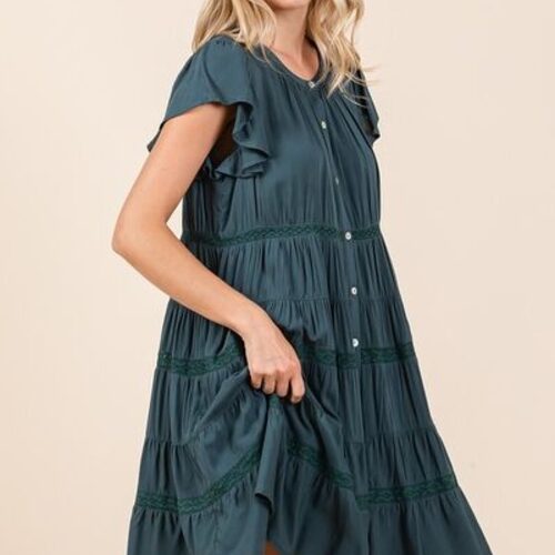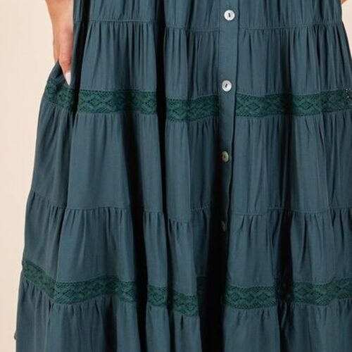 The Lace Detail Ruffled Button Down Tiered Dress is a romantic and elegant choice for a feminine outfit. The lace detailing adds a delicate and charming touch, while the ruffled tiers create a flowy and flattering silhouette. Perfect for special occasions or a dressed-up daytime look, this dress exudes a whimsical and ethereal vibe that is sure to make a statement. Pair it with heels and delicate jewelry for a sophisticated and graceful ensemble that captures a sense of effortless beauty.