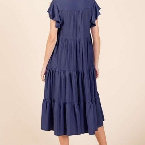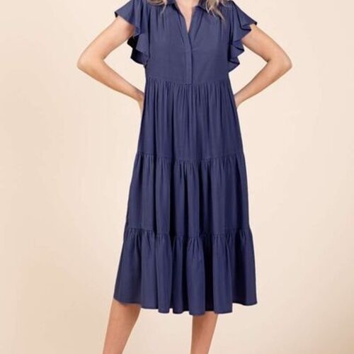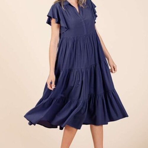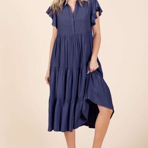 A ruffle sleeve collared V-neck tiered midi dress is a stylish and feminine dress with charming details. The ruffle sleeves add a touch of elegance and movement to the dress, while the collared V-neckline adds a polished and sophisticated touch. The tiered design creates a layered and textured look, adding dimension and visual interest to the dress. The midi length falls below the knee, making it versatile for both casual and more dressed-up occasions. This type of dress is a fashionable choice for a chic and trendy outfit, perfect for adding a touch of flair to your wardrobe.