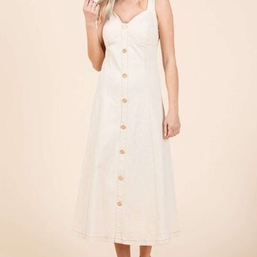 This stretch twill sleeveless midi dress is a sleek and versatile option for various occasions. The sleeveless design offers a timeless silhouette, while the midi length adds a touch of sophistication. Stay comfortable and chic in this stylish twill dress.