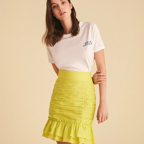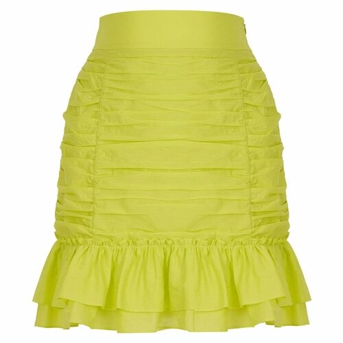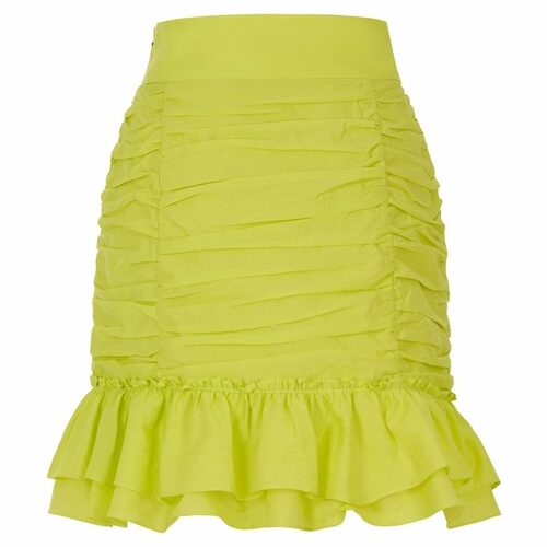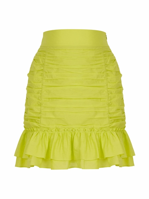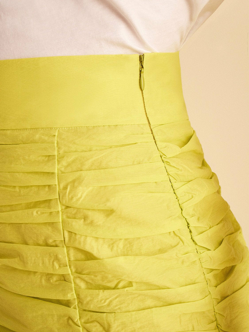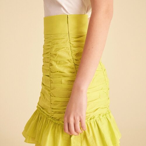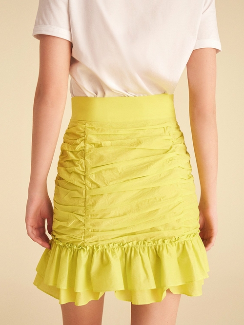 Ruched skirt with flounced hem and inner lining.Hidden in-seam side zipper.