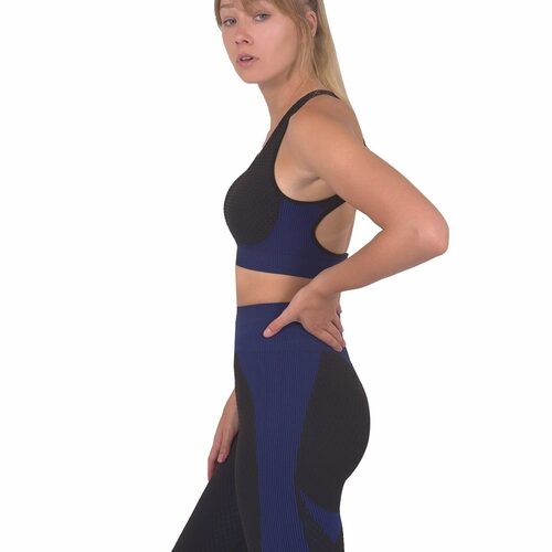 The Trois Seamless Sports Bra is unique within our collection as it features two different fabric designs within the same bra! The colorful black and navy striped design alternates with pure black ruched/stippled fabric areas, which gives this sports bra style and sophistication combined with practicality of the highest level.